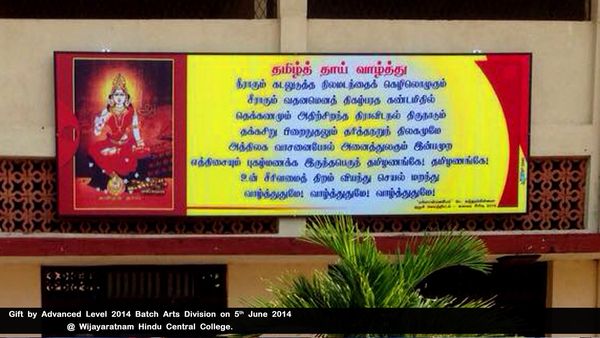 05.06.2014 அன்று நீர்கொழும்பு விஜயரத்தினம் இந்து மத்திய கல்லூரியின் உயர்தரம் 2014 கலைப்பிரிவு மாணவர்களினால் “தமிழ்த்தாய் வாழ்த்துப் பலகை” ( Flex Board ) ஒன்று பாடசாலைக்கு அன்பளிப்பாக வழங்கப்பட்டது.